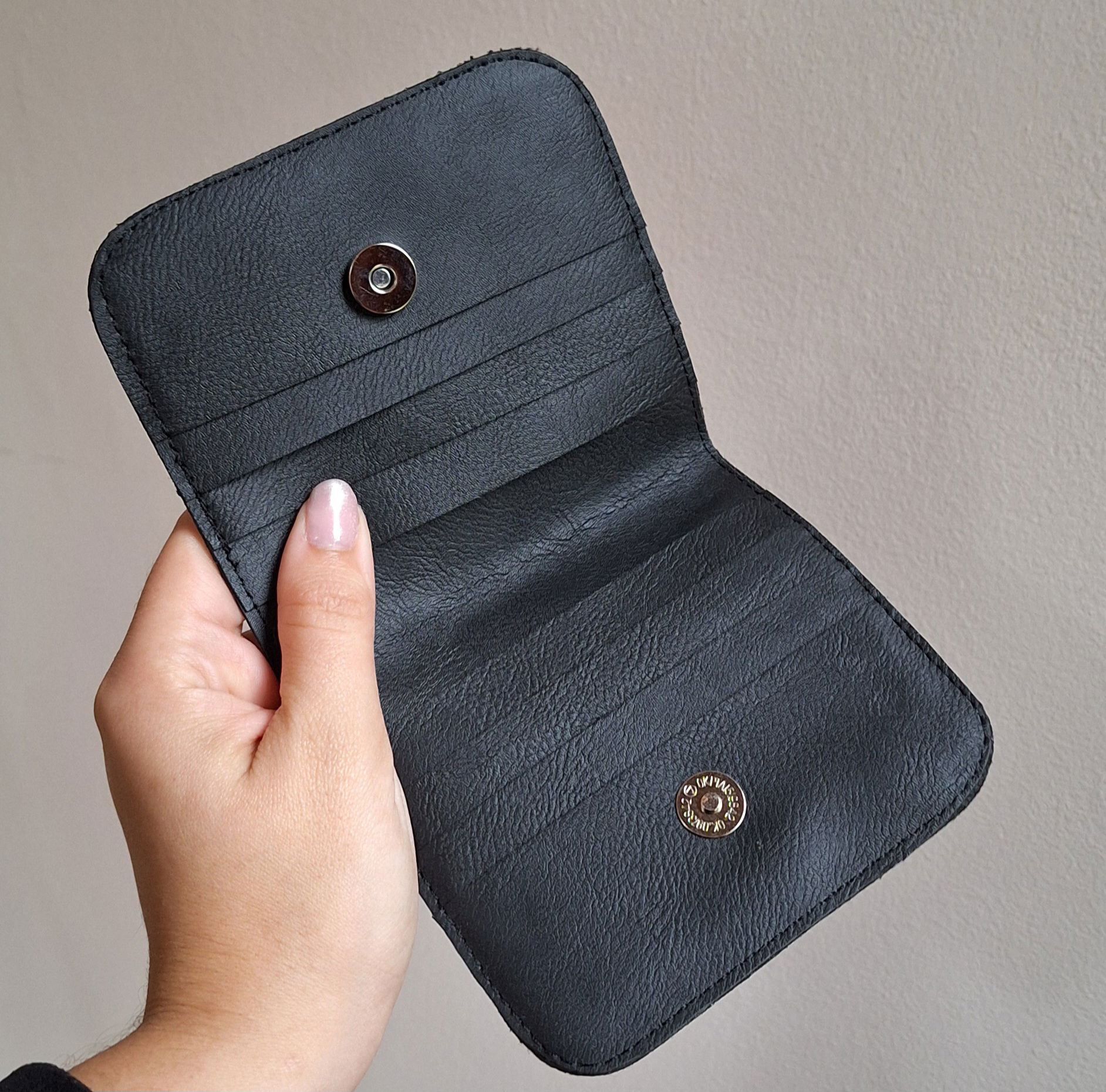 Cómodo tarjetero que cierra con botón imantado, cuenta con 8 espacios de guardado. Medidas: 10cm x 11cm